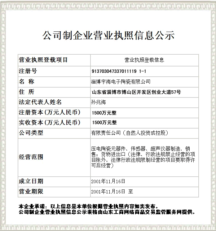 淄博宇海電子陶瓷有限公司位于淄博市博山開(kāi)發(fā)區(qū)創(chuàng)業(yè)大道57號(hào),始建于1966年,2001年11月由國(guó)營(yíng)淄博無(wú)線(xiàn)電瓷件廠(chǎng)改制為淄博宇海電子陶瓷有限公司。公司是生產(chǎn)壓電陶瓷元件的專(zhuān)業(yè)廠(chǎng)家,是中國(guó)電子元件行業(yè)協(xié)會(huì)創(chuàng)始會(huì)員、山東省先進(jìn)陶瓷創(chuàng)新創(chuàng)業(yè)共同體理事單位。